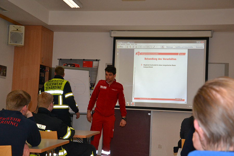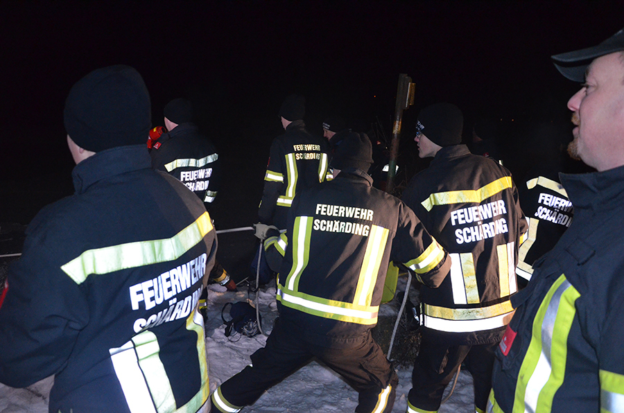 Die aktuellen Temperaturen treiben viele Wintersportler auf die Eisflächen. Nachdem gerade die Stadt Schärding mit Pram, Lutzbucht, Innsporne, … ein großes Freizeit-Eisangebot hat, haben sich die Mitglieder der FF Schärding speziell auf Einsätze in diesen Bereichen fortgebildet. Am Dienstag, 25. Jänner stand deshalb die Übung „Rettung von ins Eis eingebrochenen Personen“ am Übungsplan. In einer kurzen Theorieeinheit wurden die wichtigsten Eckpunkte, Vorgehensweisen und Einsatzregeln eines solchen Einsatzes wiederholt. Die ebenfalls teilnehmenden Sanitäter des Roten Kreuzes vertieften dabei das Wissen im Bereich „Erste Hilfe“ und Zusammenarbeit mit dem Roten Kreuz. Im Anschluss ging es rasch zur Praxis. Dafür war auf der Pram bereits ein Loch ausgeschnitten, wo eine sichere Übungsmöglichkeit bestand. Das Eis hatte dort bereits eine Dicke von mehr als 15 cm erreicht. Der Bereich war aus Sicherheitsgründen auch gut ausgeleuchtet. Taucher stiegen dazu in das eisige Nass und riefen um Hilfe. Mit unterschiedlichen Rettungsmethoden wurden nun in mehreren Durchgängen Personenrettungen durchgeführt. Besonders wichtig ist bei solchen Einsatzszenarien die Sicherung des Retters mittels Rettungsleine und Schwimmweste. Auch die zu Rettenden veränderten ihre Lage, so konnten diese manchmal noch selbst bei der Rettung mithelfen, andermal stellten sie sich bewusstlos. Nachdem im sicheren Bereich nun alle Methoden ausprobiert waren, konnte die dritte Übungsstufe eingeleitet werden. Die Taucher spazierten so lange entlang der Pram in Richtung Inn, bis sie tatsächlich selbst einbrachen. Nun mussten die Retter – ebenfalls wieder bestens gesichert – besonders Acht geben. Denn nachdem dort das Eis nicht mehr so dick war, bestand die realistische Gefahr, dass beim Rettungsversuch das Eis weiter bricht. Aber auch dieses Szenario meisterten die Einsatzkräfte bestens und gewannen so wesentliche Erkenntnisse für den Ernstfall. Abschließend wurde die Einbruchsstelle noch so abgesichert, dass Eissportler nicht versehentlich in das geschnittene Loch fallen können.