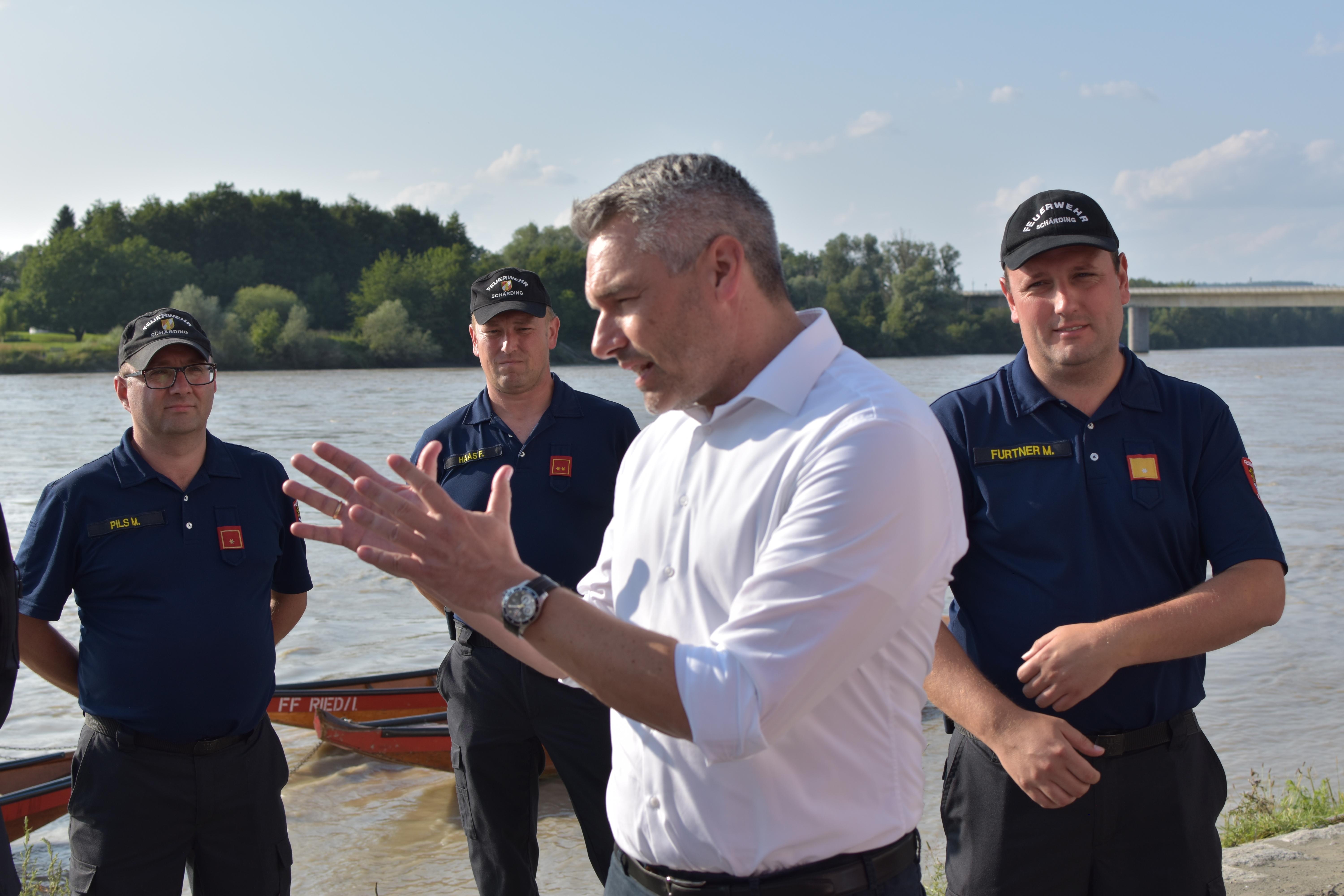 Am 20. Juli besuchte Innenminister Karl Nehammer die Barockstadt Schärding. An der Innlände wurde er von den Schärdinger Blaulichtorganisationen, sowie Bezirkshauptmann Rudolf Greiner und Bürgermeister Franz Angerer empfangen. Bei einer Begehung konnte er sich ein Bild von der aktuellen Lage machen und sich von der Effizienz des Hochwasserschutzes und der wertvollen ehrenamtlichen Arbeit der Feuerwehr überzeugen. Kommandant Markus Furtner durfte die Abwicklung im Hochwassereinsatz erläutern und die damit verbundene Arbeit der Einsatzkräfte näherbringen. Gerade die in Schärding sehr gut funktionierende Zusammenarbeit zwischen Feuerwehr, Polizei, Rotem Kreuz, der Stadtgemeinde und der Bezirkshauptmannschaft, sowie dem städtischen Bauhof hob Furtner in seinen erklärenden Worten hervor. Auch über die Finanzierung aus Katastrophenschutzmitteln und die zukünftige Entwicklung im Bereich des Katastrophenschutzes wechselten Feuerwehrkommandant Markus Furtner, Bezirks-Feuerwehrkommandant Alfred Deschberger und Bundesminister Nehammer einige Worte. Beeindruckt über die Professionalität bedankte sich Nehammer bei allen Einsatzkräften die Ihre Freizeit in den Dienst der Schärdinger Bürgerinnen und Bürger stellen.