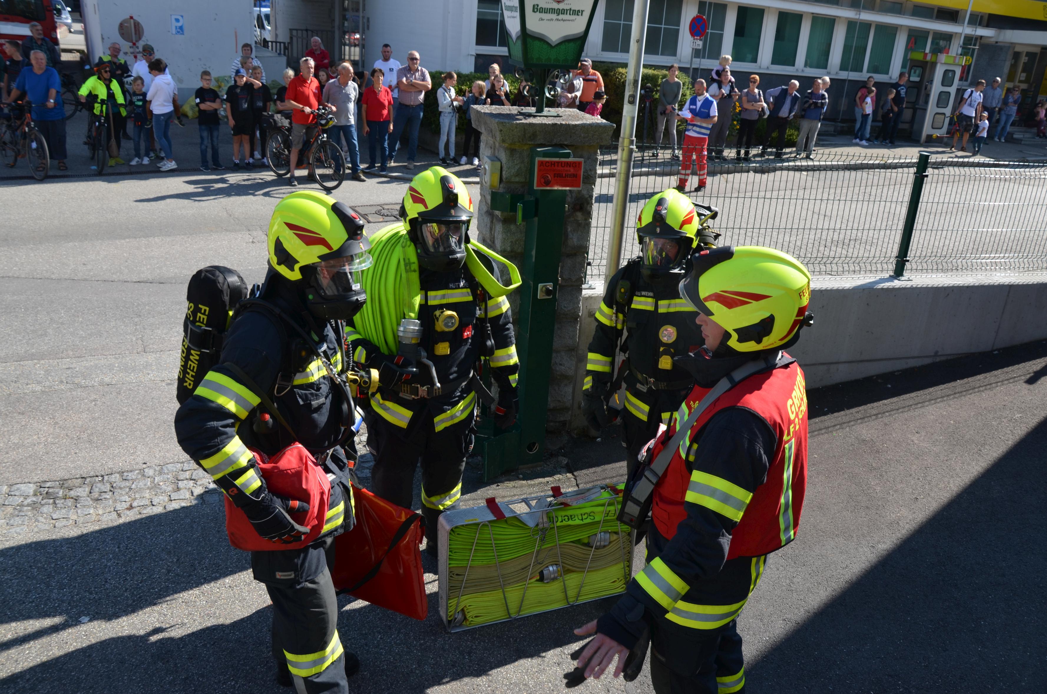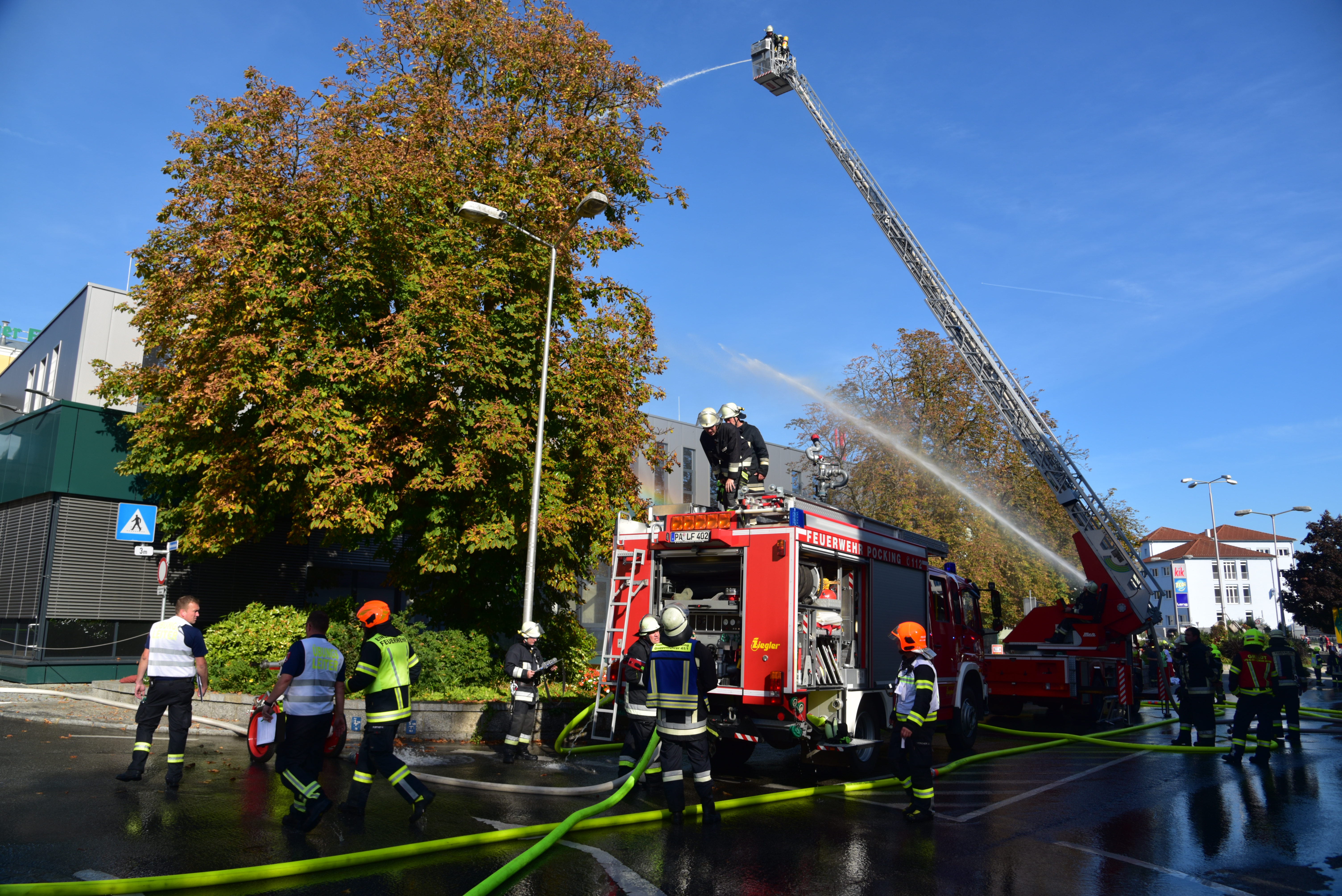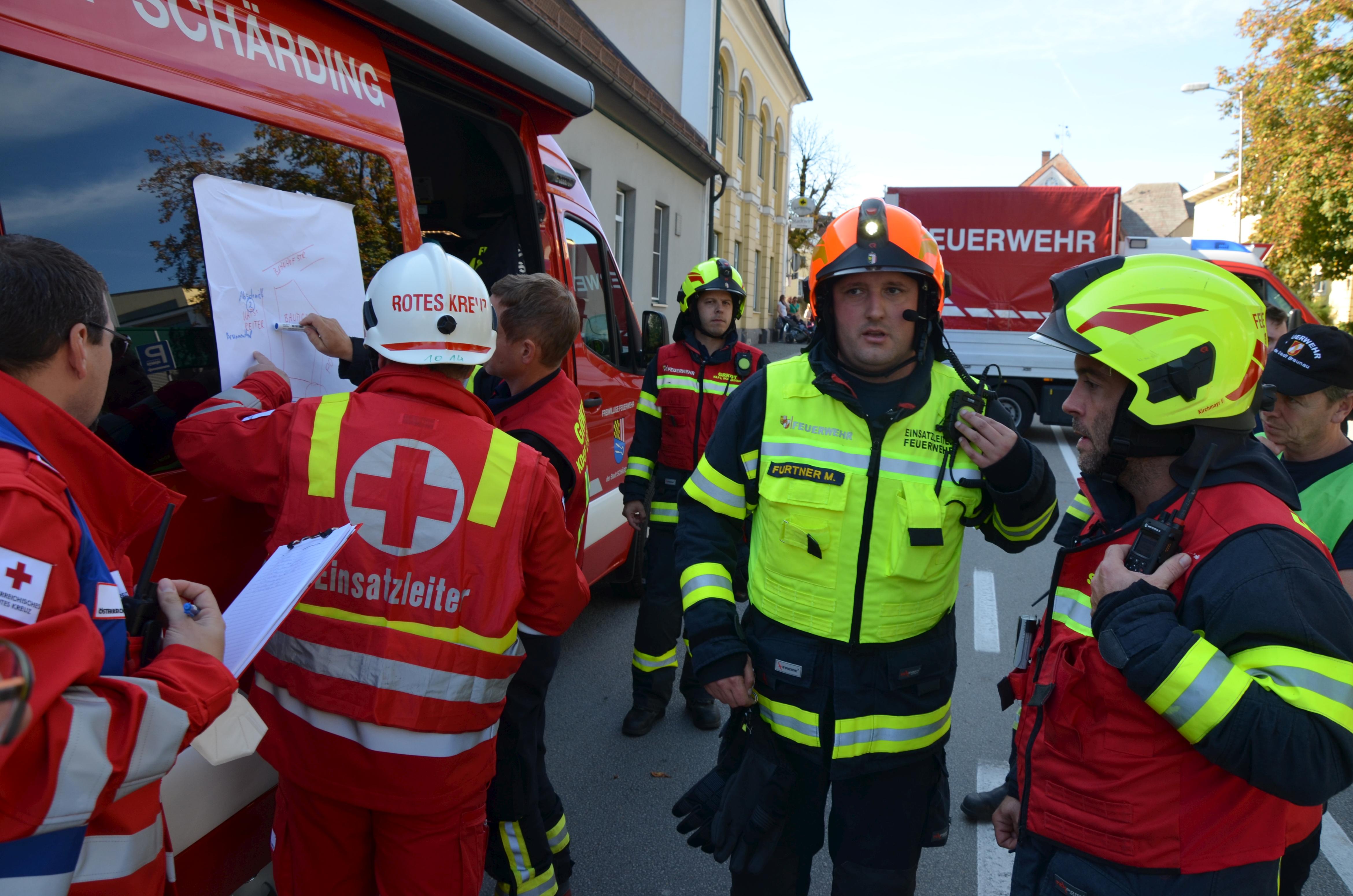 Zu dieser Übungsalarmierung wurde am 2. Oktober um 13:30 Uhr die Freiwillige Feuerwehr der Stadt Schärding, sowie in weiterer Folge 16 weitere Feuerwehren aus dem Bezirk, zu einer Großübung im Areal der Brauerei Baumgartner in Schärding gerufen. Übungsannahme war ein Großbrand im Innenbereich der Brauerei, wo neben der Brandbekämpfung ebenso 8 verletzte Personen von Feuerwehrkameraden unter Einsatz von schwerem Atemschutz teilweise über Drehleitern gerettet werden mussten. Die 209 eingesetzten Feuerwehr-Einsatzkräfte erprobten zusätzlich eine Wasserbeförderung mittels mehreren hundert Meter Schlauch von Inn und der Pram, damit die angenommene Brandbekämpfung sichergestellt werden konnte. „Man sieht, wie wichtig die zahlreichen Stunden an Aus- und Weiterbildung jedes Jahr für uns als Feuerwehr ist, damit jeder Handgriff im Ernstfall sitzt und die Zusammenarbeit zwischen den Kameraden, auch aus unterschiedlichen Feuerwehren, reibungslos funktioniert!“, so der Einsatzleiter und Kommandant der Freiwilligen Feuerwehr der Stadt Schärding Markus Furtner. Ebenso stellte auch die örtliche Gegebenheit eine besondere Herausforderung dar, in dem einerseits ein Übergreifen des Feuers auf den dicht verbauten Stadtkern zu berücksichtigen war und außerdem der Zentrumsverkehr großräumig umgeleitet und stark frequentierte Straßen, während dem Übungsszenario gesperrt werden mussten. Dies zeigt wiederum, wie wichtig auch die Zusammenarbeit mit allen Blaulichtorganisationen bei einem derartigen Großszenario ist. Auch die Polizei und das Rote Kreuz waren eingebunden und die Abläufe wurden hier geprobt. Insgesamt beteiligten sich 270 Einsatzkräfte an der Übung. Auch Bürgermeister Franz Angerer – der in ständigem Kontakt mit der Einsatzleitung war – bedankte sich bei allen eingesetzten Einsatzkräften: „Es ist mir ein besonderes Anliegen, jedem Einzelnen DANKE zu sagen, denn an einem so schönen Herbsttag hätte es für alle Beteiligten sicher auch eine andere Freizeitbeschäftigung gegeben – aber nein, 270 Männer und Frauen haben sich um die Sicherheit in unserer schönen Barockstadt Schärding gekümmert und das ist nicht selbstverständlich“.