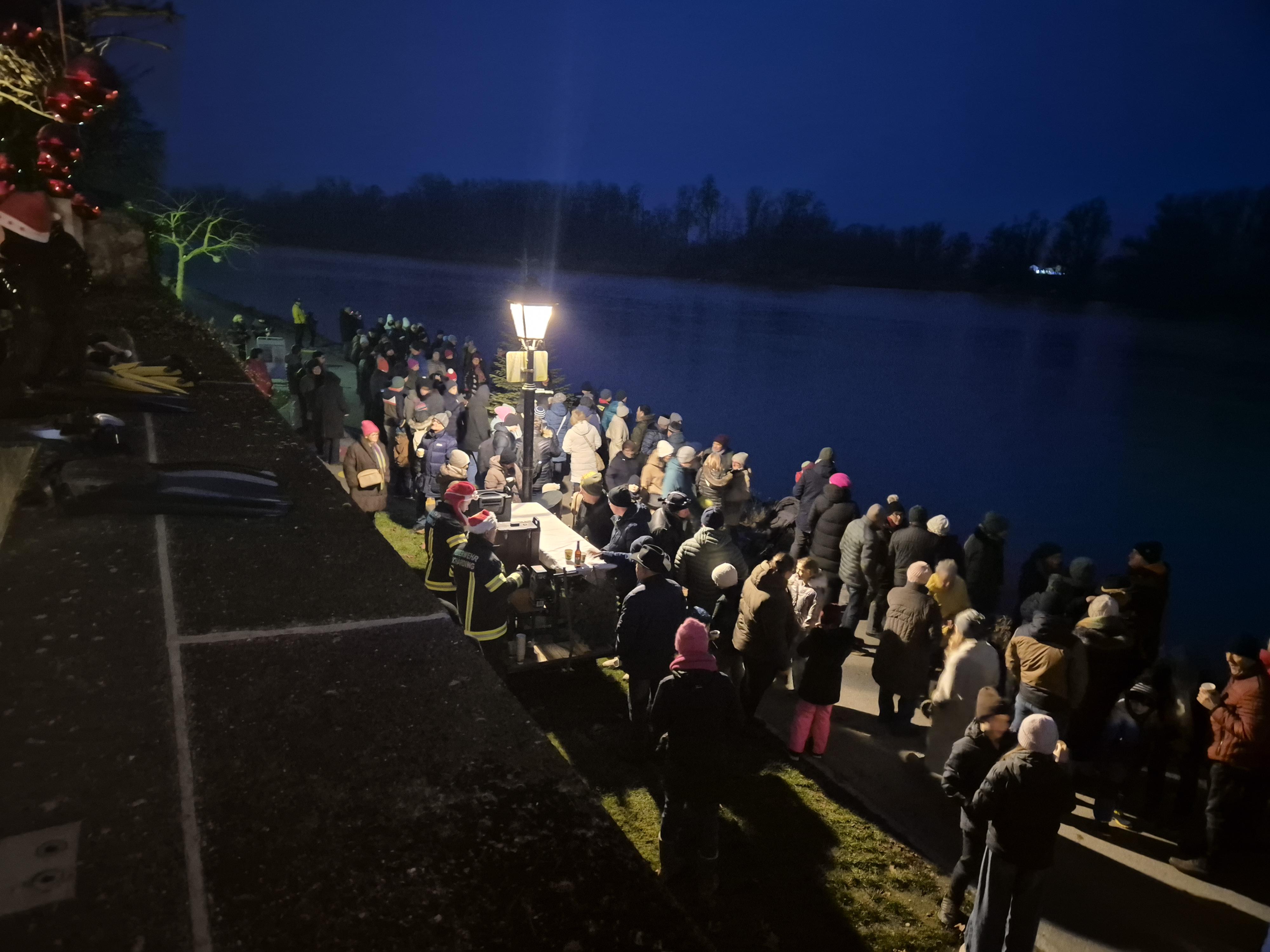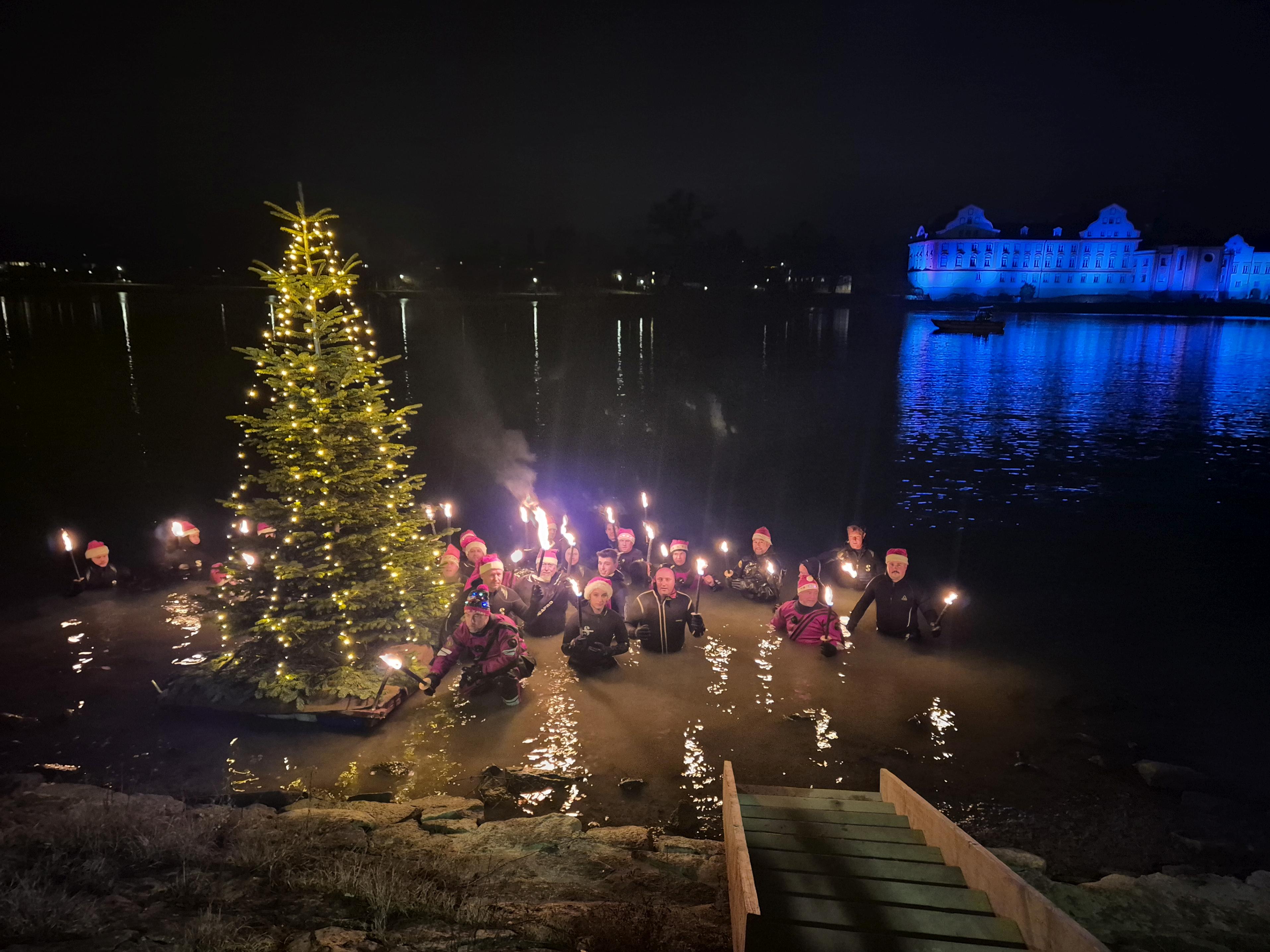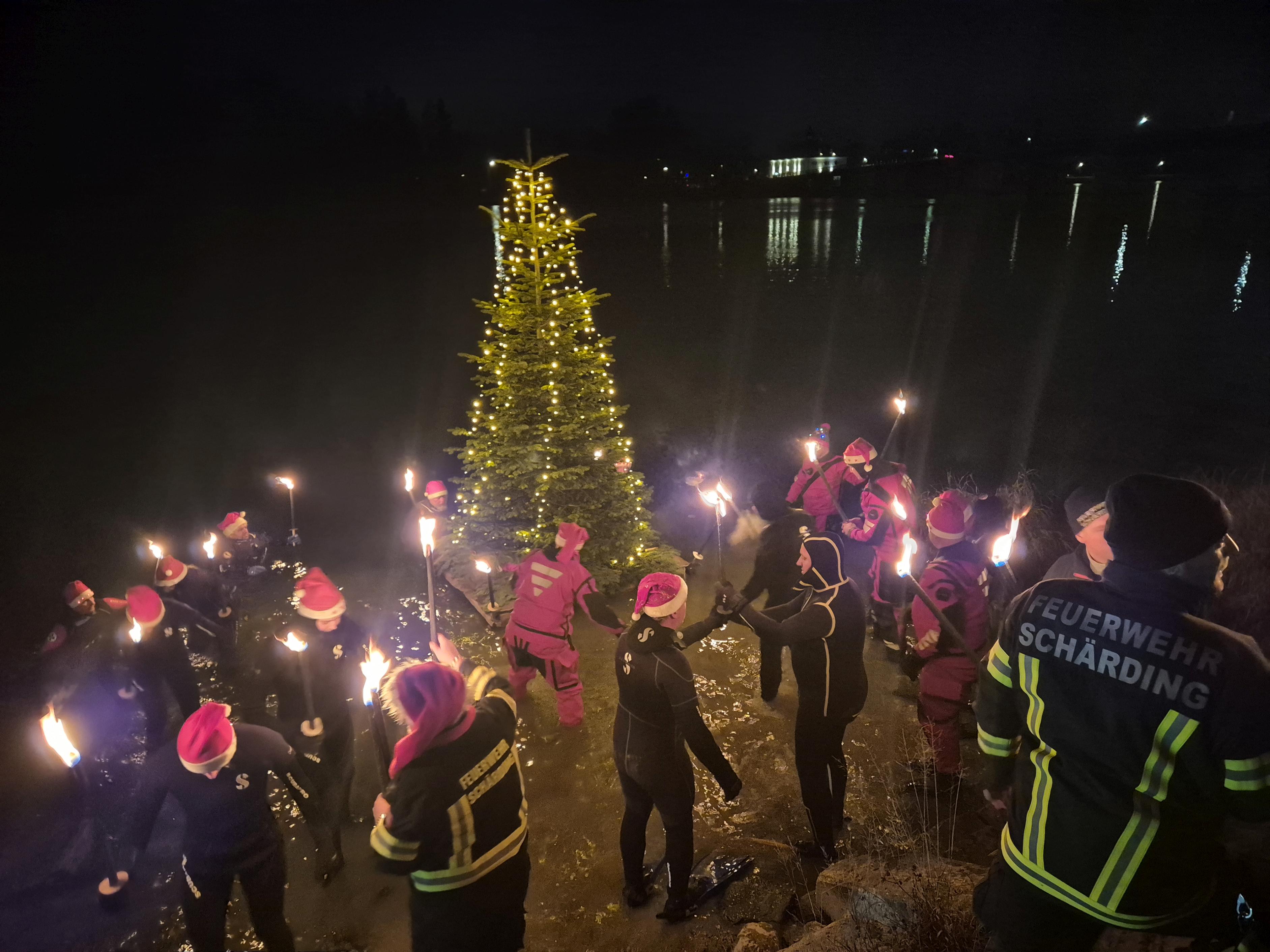 Am 20. Dezember ging im 41. Jahr des Bestehens das Christbaumschwimmen über die Bühne. Wie alle Jahre waren viele Personen an die Schärdinger Innlände gekommen, um der stimmungsvollen Veranstaltung beizuwohnen. Taucher der Feuerwehren Schärding, Ried und Grafenau schwammen mit Fackeln und einem beleuchteten Christbaum von der Innlände im Bereich des Gesundheitshotels Gugerbauer bis zum Wassertor entlang. Unterstützt wurden sie auch von einer Abordnung der Österreichischen Wasserrettung – Ortsstelle Schärding. Keine leichte und vor allem körperlich fordernde Aufgabe, wenn man bedenkt, dass die Wassertemperatur bei nur 4,3° Celsius lag. Insgesamt 26 Schwimmerinnen und Schwimmer stiegen in den kühlen Inn. Besonders hervorzuheben ist Bernhard Kirchmayr, welcher der einzige Schwimmer ist, der sowohl beim 1. Schwimmen 1984 dabei war und auch im Jahr 2025 ins Wasser gestiegen ist. Im Anschluss kam der Weihnachtsmann mit einer Zille über den Inn und brachte für die Kinder kleine Sackerl mit Süßigkeiten. Musikalisch umrahmt wurde die Veranstaltung von den Bläsern der Stadtkapelle Schärding. Grund für das Schwimmen ist der Dank an ein weiteres unfallfreies Tauchjahr. Das Christbaumschwimmen hat sich in Schärding mittlerweile als fester Bestandteil der Weihnachtszeit eingebürgert und hält die festliche Stimmung lebendig.