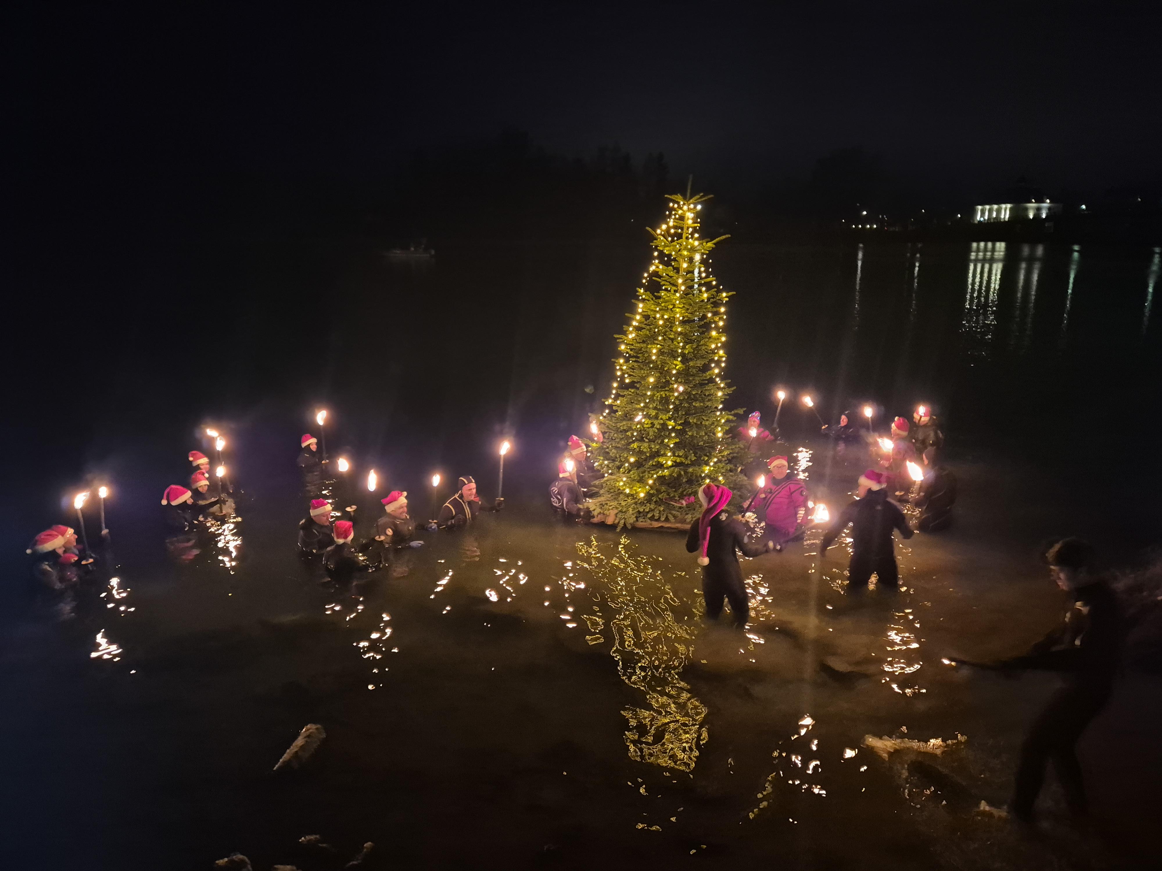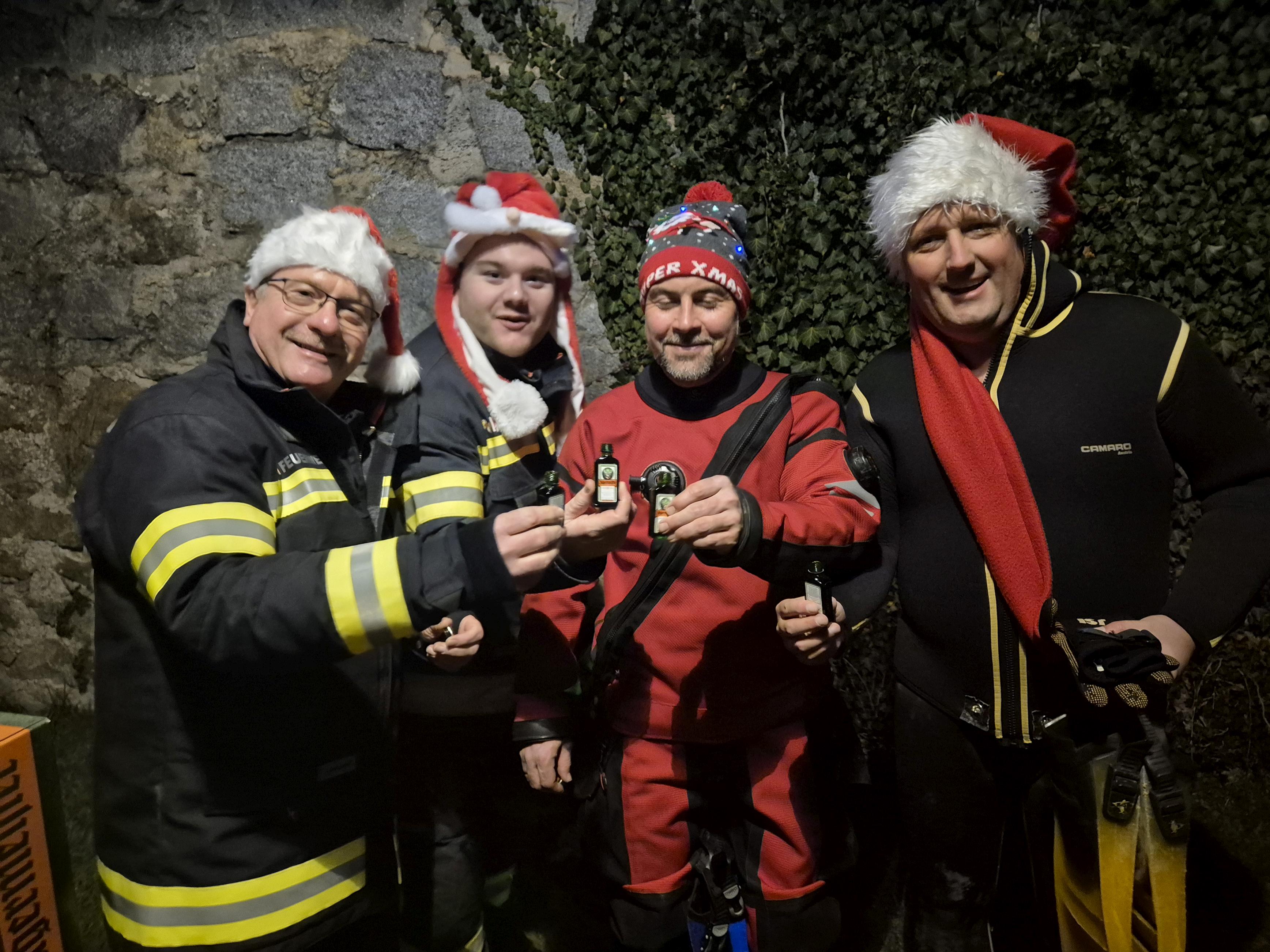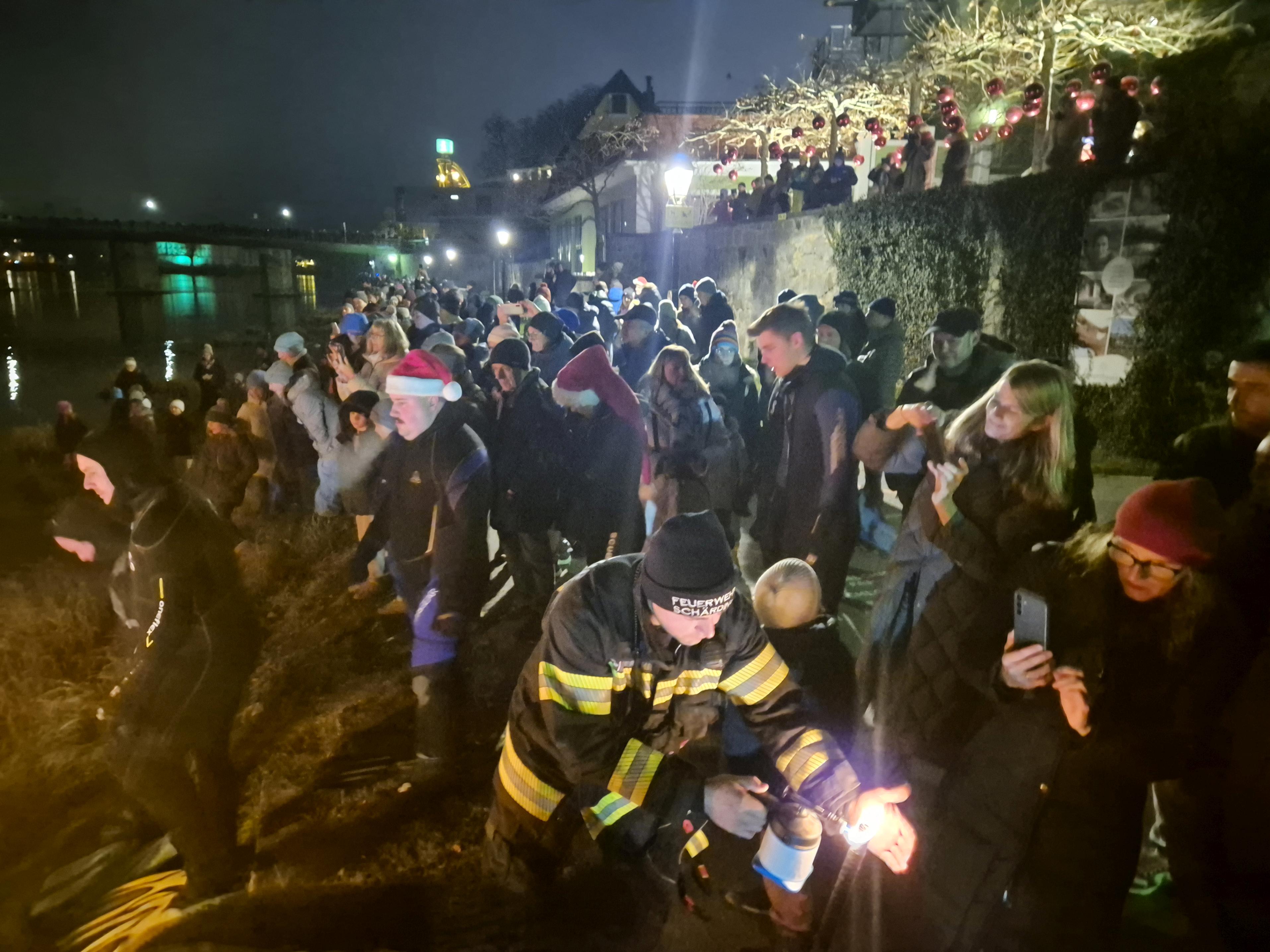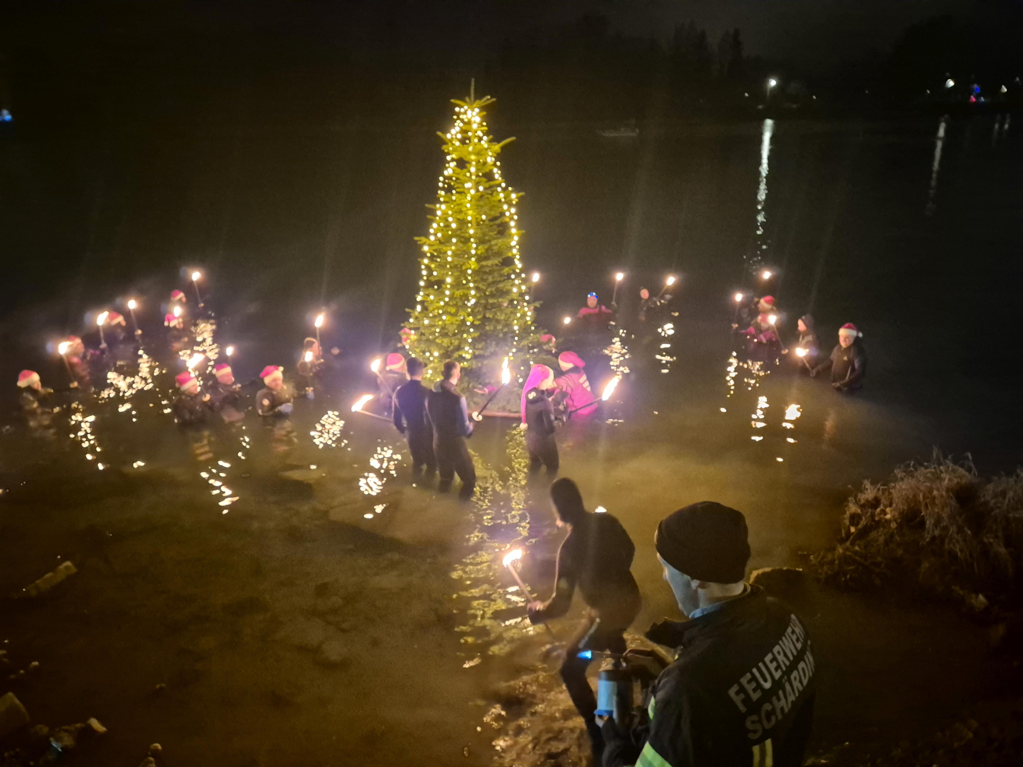 Am 20. Dezember ging im 41. Jahr des Bestehens das Christbaumschwimmen über die Bühne. Wie alle Jahre waren viele Personen an die Schärdinger Innlände gekommen, um der stimmungsvollen Veranstaltung beizuwohnen. Taucher der Feuerwehren Schärding, Ried und Grafenau schwammen mit Fackeln und einem beleuchteten Christbaum von der Innlände im Bereich des Gesundheitshotels Gugerbauer bis zum Wassertor entlang. Unterstützt wurden sie auch von einer Abordnung der Österreichischen Wasserrettung – Ortsstelle Schärding. Keine leichte und vor allem körperlich fordernde Aufgabe, wenn man bedenkt, dass die Wassertemperatur bei nur 4,3° Celsius lag. Insgesamt 26 Schwimmerinnen und Schwimmer stiegen in den kühlen Inn. Besonders hervorzuheben ist Bernhard Kirchmayr, welcher der einzige Schwimmer ist, der sowohl beim 1. Schwimmen 1984 dabei war und auch im Jahr 2025 ins Wasser gestiegen ist. Im Anschluss kam der Weihnachtsmann mit einer Zille über den Inn und brachte für die Kinder kleine Sackerl mit Süßigkeiten. Musikalisch umrahmt wurde die Veranstaltung von den Bläsern der Stadtkapelle Schärding. Grund für das Schwimmen ist der Dank an ein weiteres unfallfreies Tauchjahr. Das Christbaumschwimmen hat sich in Schärding mittlerweile als fester Bestandteil der Weihnachtszeit eingebürgert und hält die festliche Stimmung lebendig.