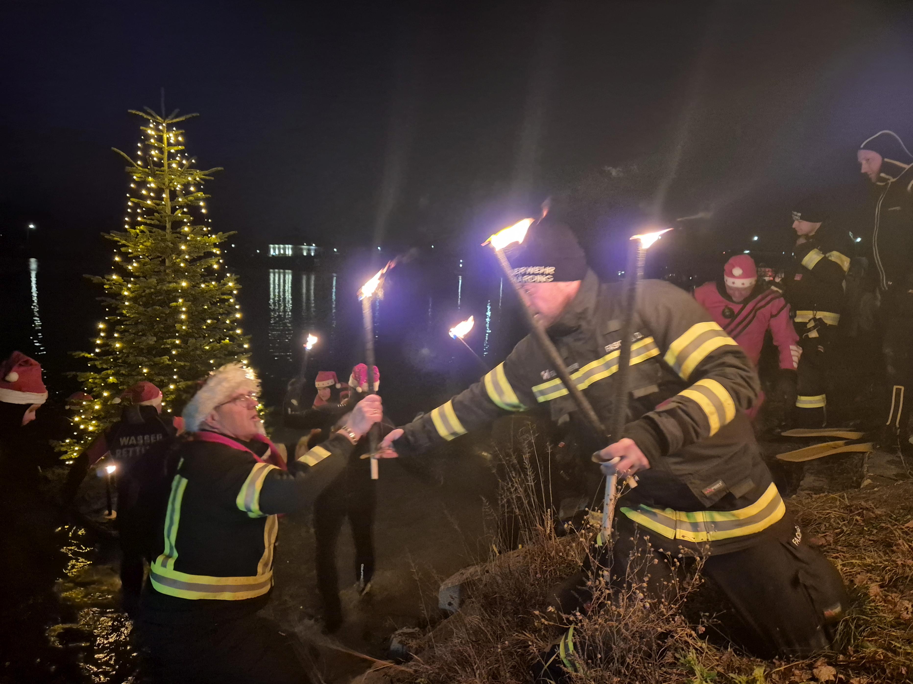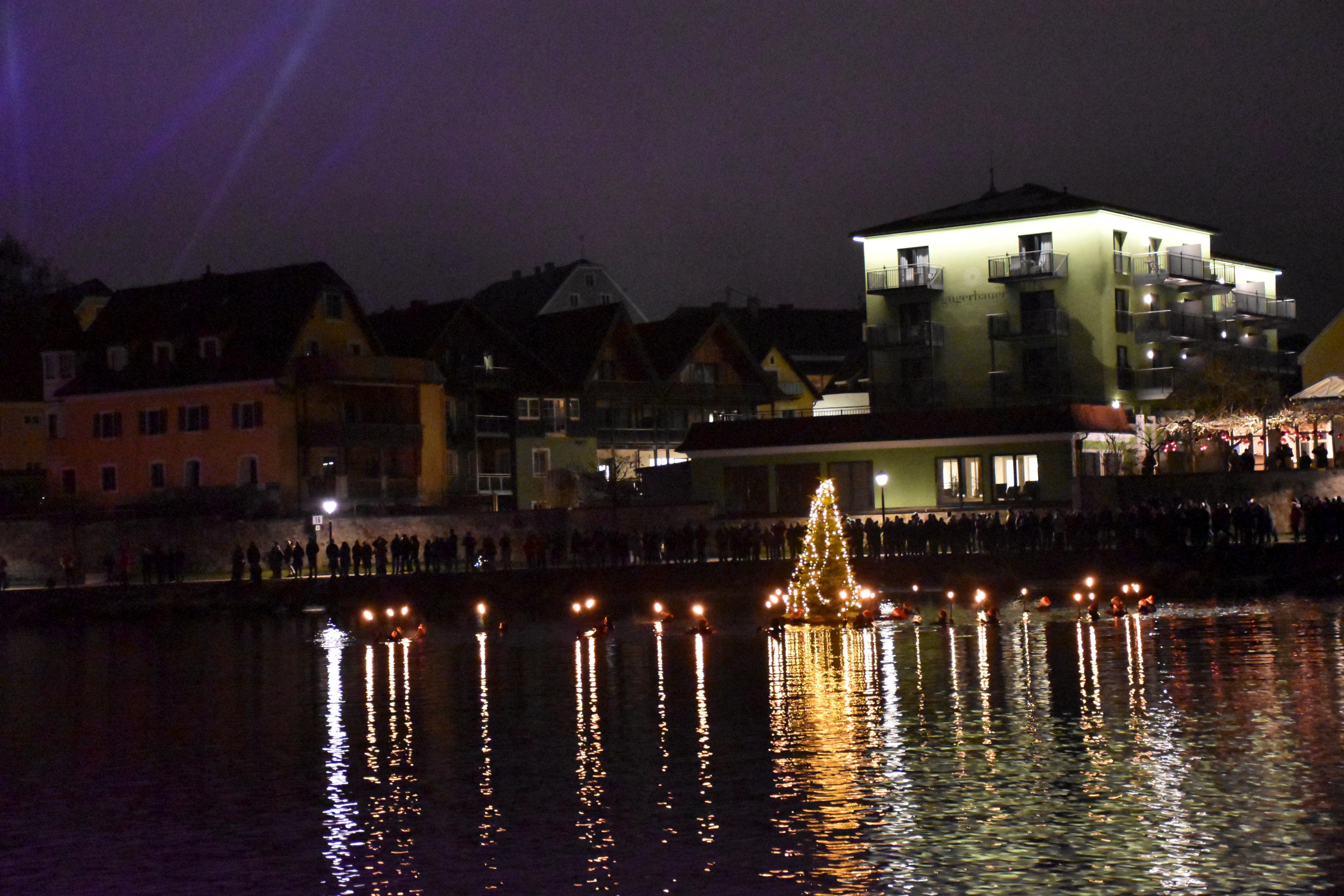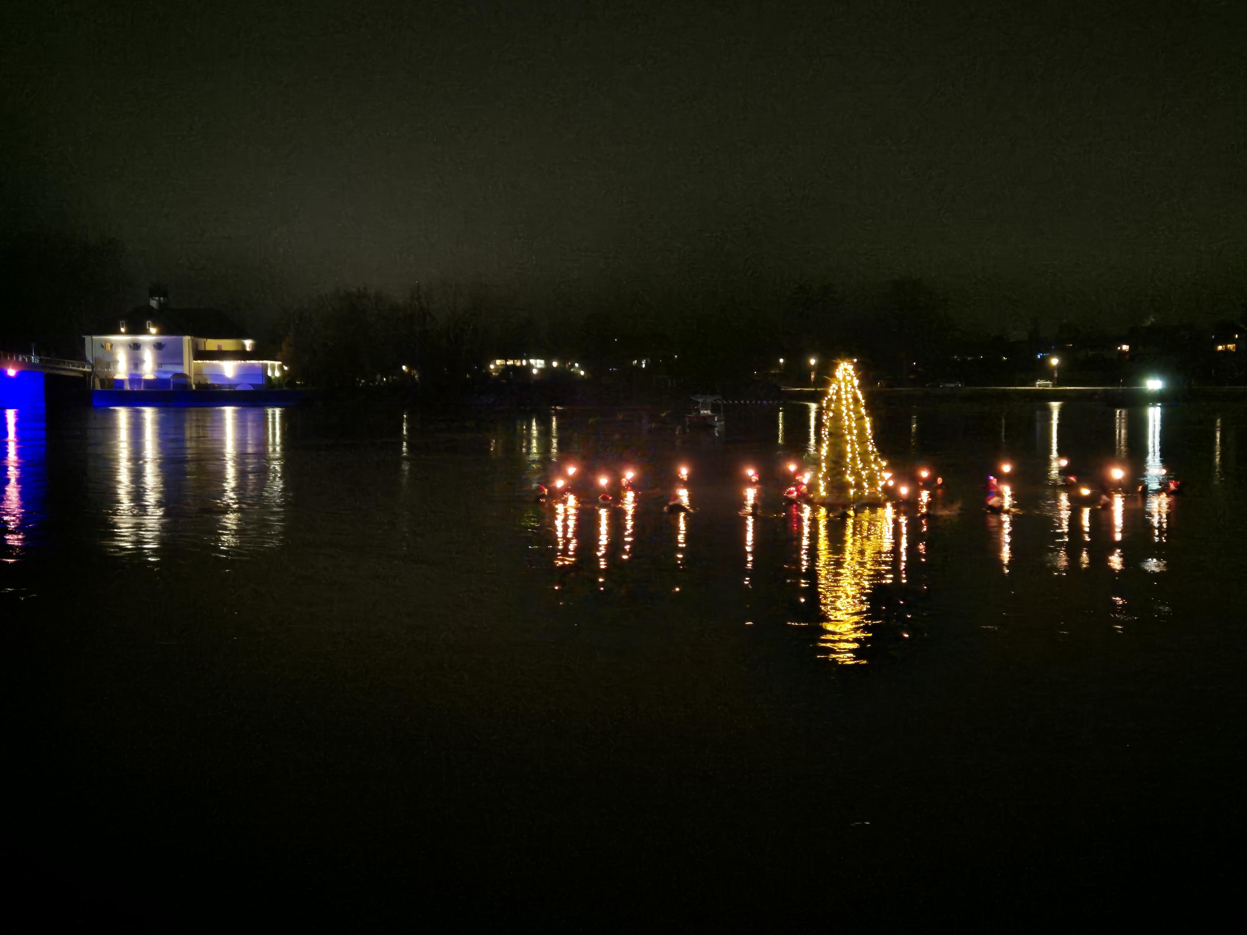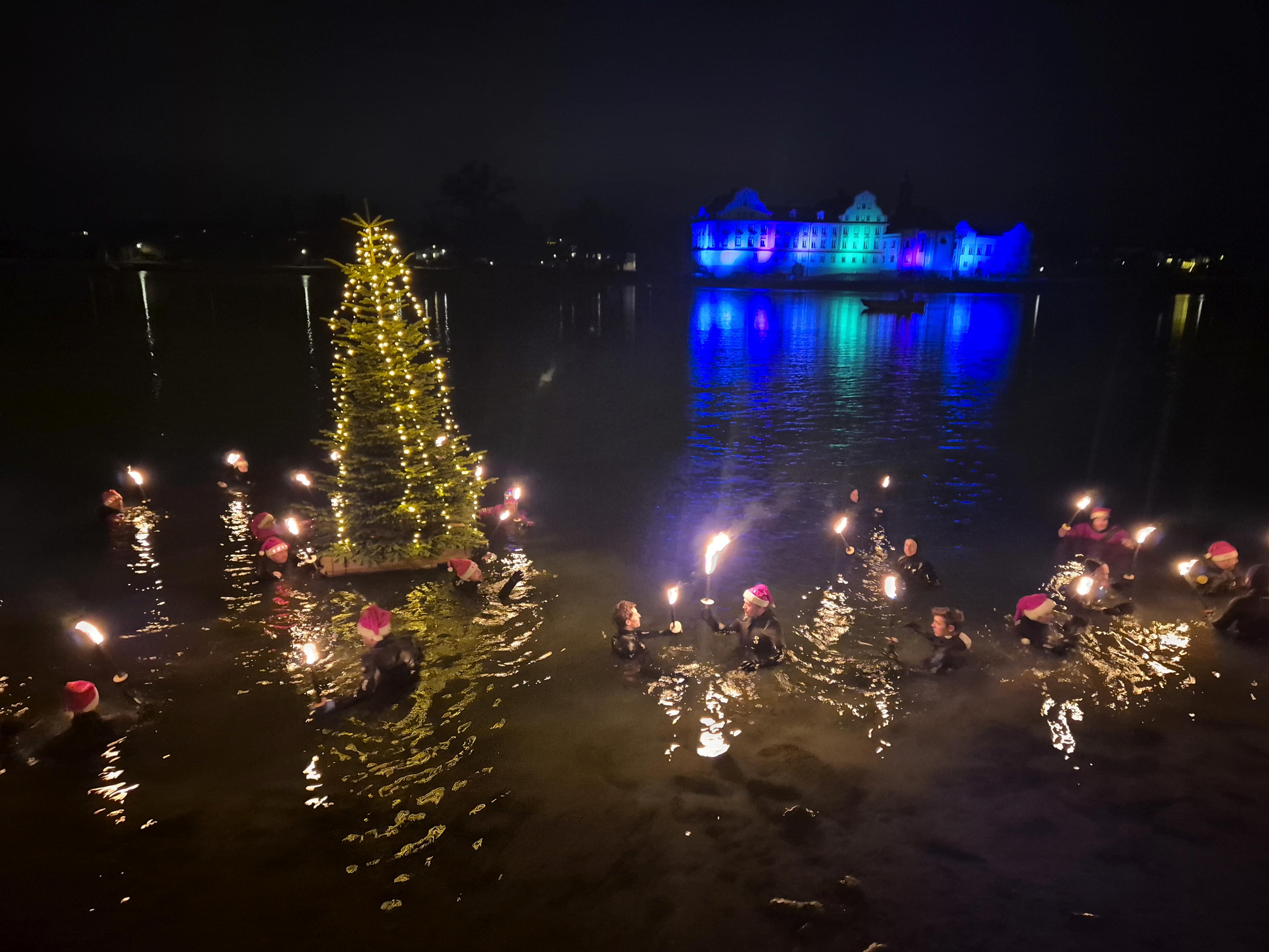 Am 20. Dezember ging im 41. Jahr des Bestehens das Christbaumschwimmen über die Bühne. Wie alle Jahre waren viele Personen an die Schärdinger Innlände gekommen, um der stimmungsvollen Veranstaltung beizuwohnen. Taucher der Feuerwehren Schärding, Ried und Grafenau schwammen mit Fackeln und einem beleuchteten Christbaum von der Innlände im Bereich des Gesundheitshotels Gugerbauer bis zum Wassertor entlang. Unterstützt wurden sie auch von einer Abordnung der Österreichischen Wasserrettung – Ortsstelle Schärding. Keine leichte und vor allem körperlich fordernde Aufgabe, wenn man bedenkt, dass die Wassertemperatur bei nur 4,3° Celsius lag. Insgesamt 26 Schwimmerinnen und Schwimmer stiegen in den kühlen Inn. Besonders hervorzuheben ist Bernhard Kirchmayr, welcher der einzige Schwimmer ist, der sowohl beim 1. Schwimmen 1984 dabei war und auch im Jahr 2025 ins Wasser gestiegen ist. Im Anschluss kam der Weihnachtsmann mit einer Zille über den Inn und brachte für die Kinder kleine Sackerl mit Süßigkeiten. Musikalisch umrahmt wurde die Veranstaltung von den Bläsern der Stadtkapelle Schärding. Grund für das Schwimmen ist der Dank an ein weiteres unfallfreies Tauchjahr. Das Christbaumschwimmen hat sich in Schärding mittlerweile als fester Bestandteil der Weihnachtszeit eingebürgert und hält die festliche Stimmung lebendig.